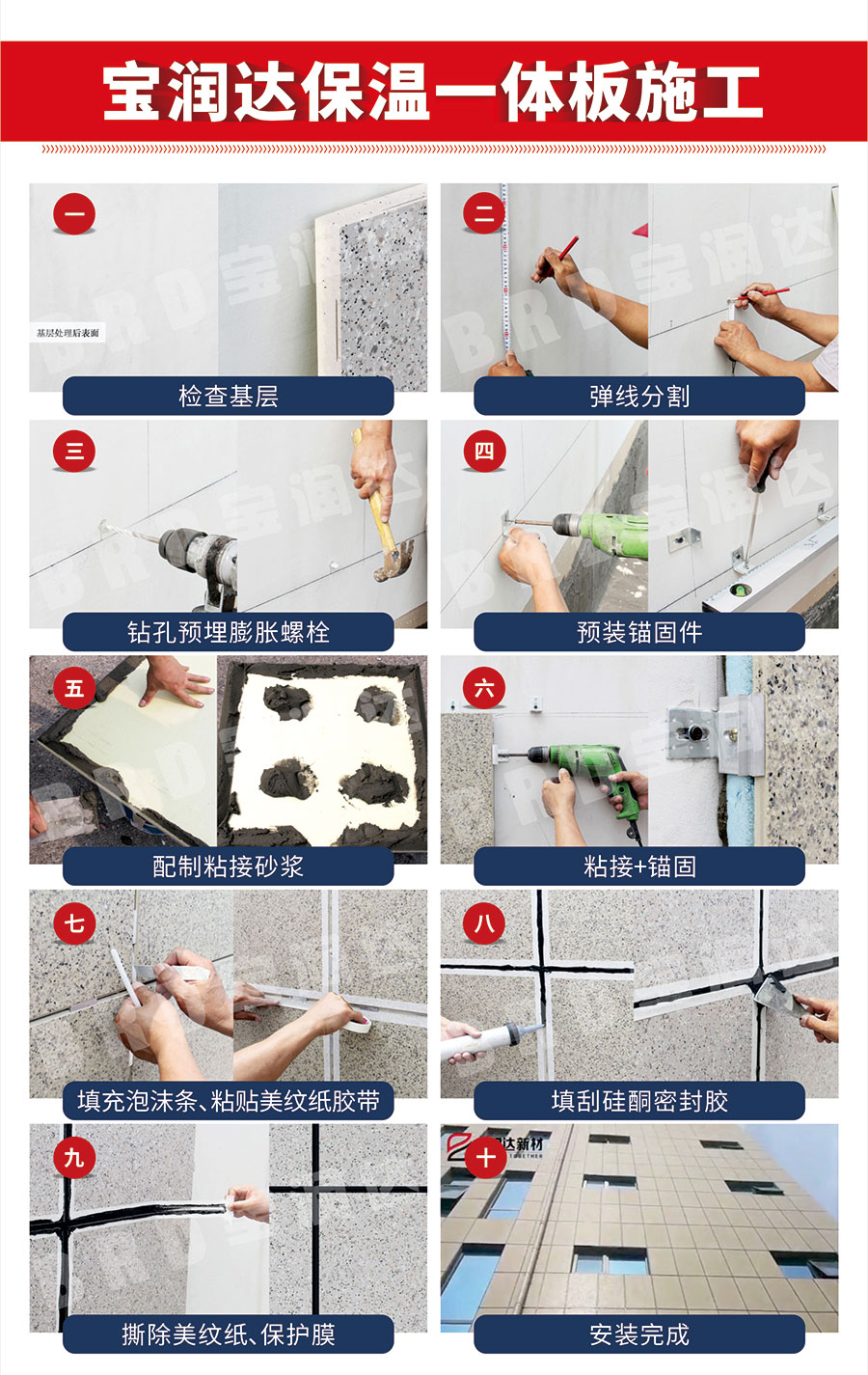 寶潤達在保溫裝飾一體板領域的優(yōu)勢,不僅僅只是建立在現(xiàn)代化的生產車間、先進的制造工藝、卓越的產品性能上。寶潤達自1995年涉足外墻裝飾領域以來,積累了24年的行業(yè)經(jīng)驗,擁有一支行業(yè)高水準的設計、安裝施工隊伍,真正具備集產品、設計、施工為一體,打造精品工程的能力。只要您給寶潤達參與的機會,我們就有十足的信心向您提供放心的系統(tǒng)化解決方案。寶潤達外墻保溫裝飾一體板(干掛)施工安裝工藝